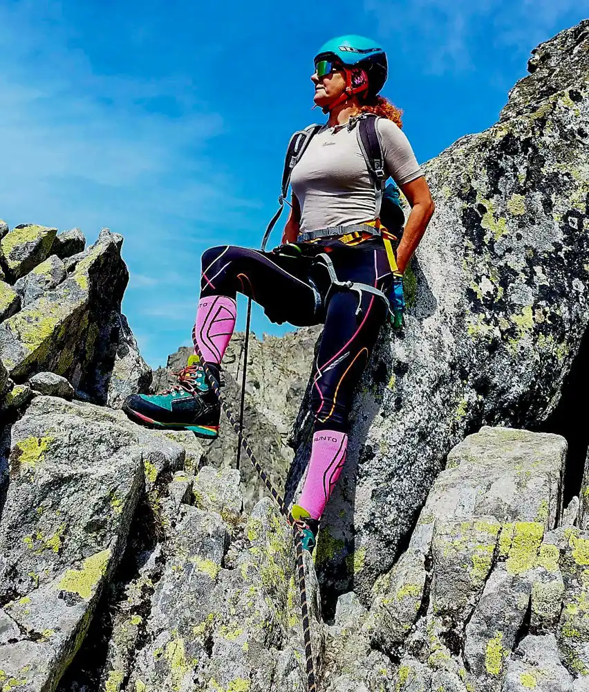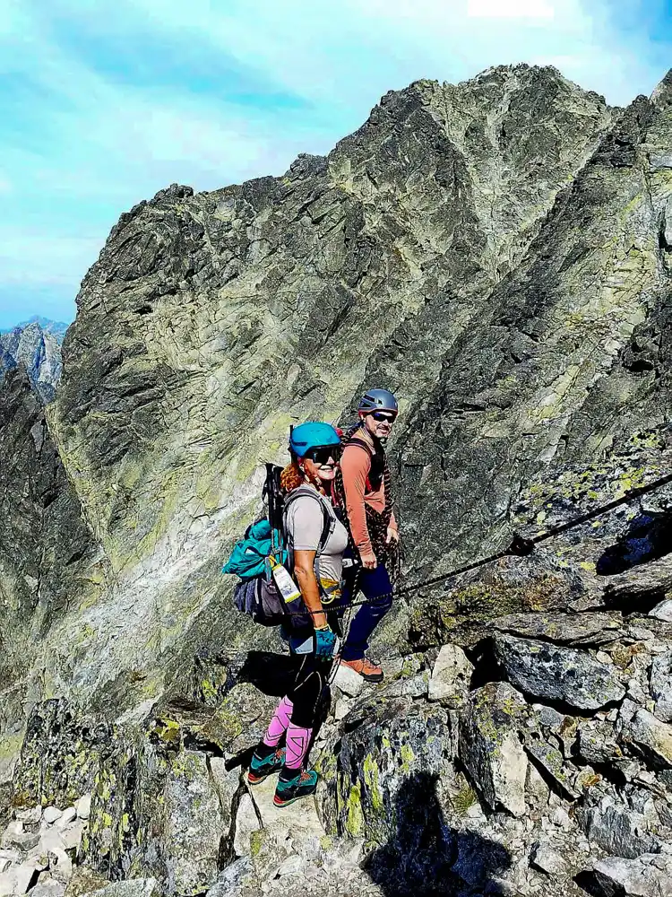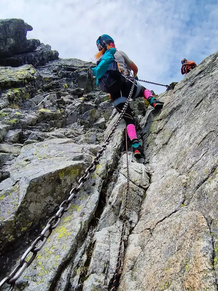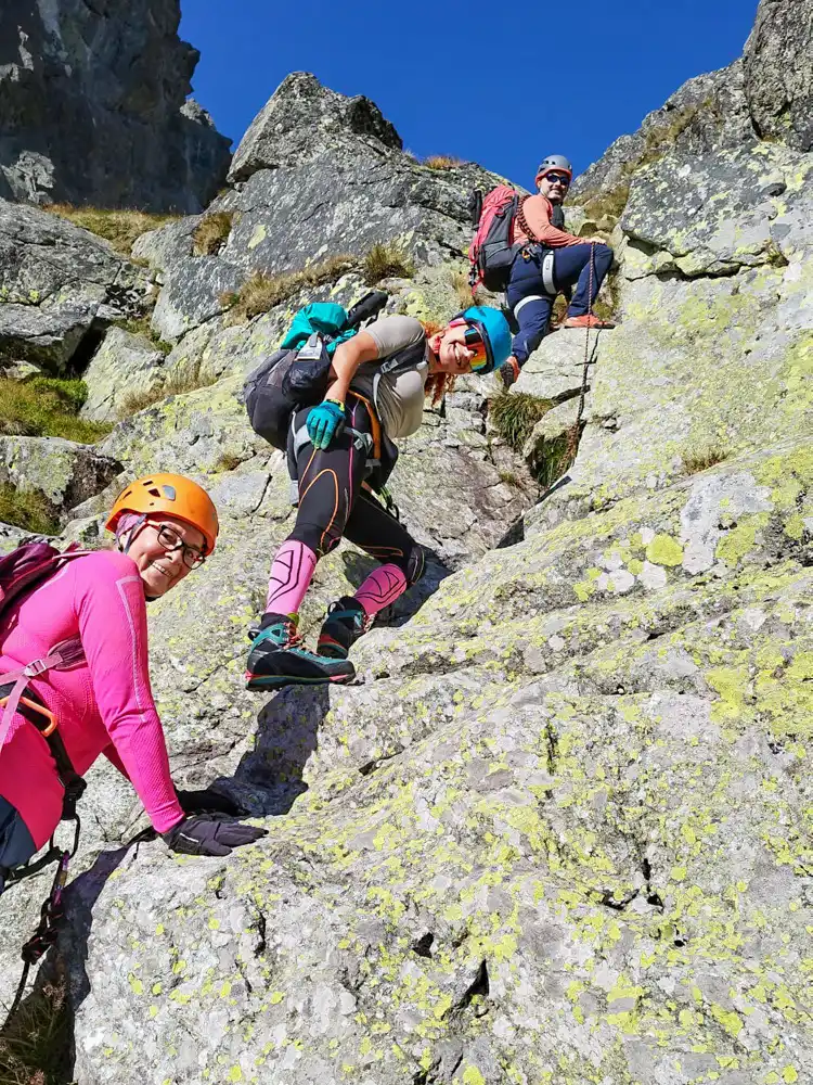 The first section, through the Velická Valley, past the Eternal Rain waterfall and up to Kvetnica, felt almost relaxed. Then the real climb started. We strapped on our harnesses, helmets, tied into the rope – and tackled the Velická Próba.