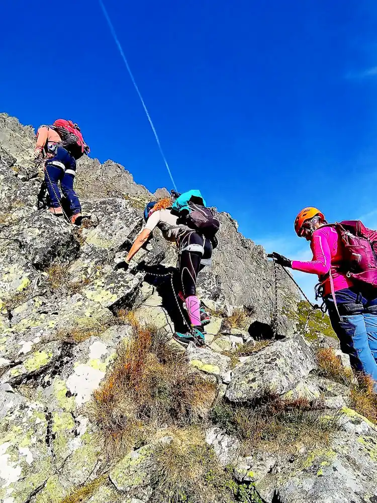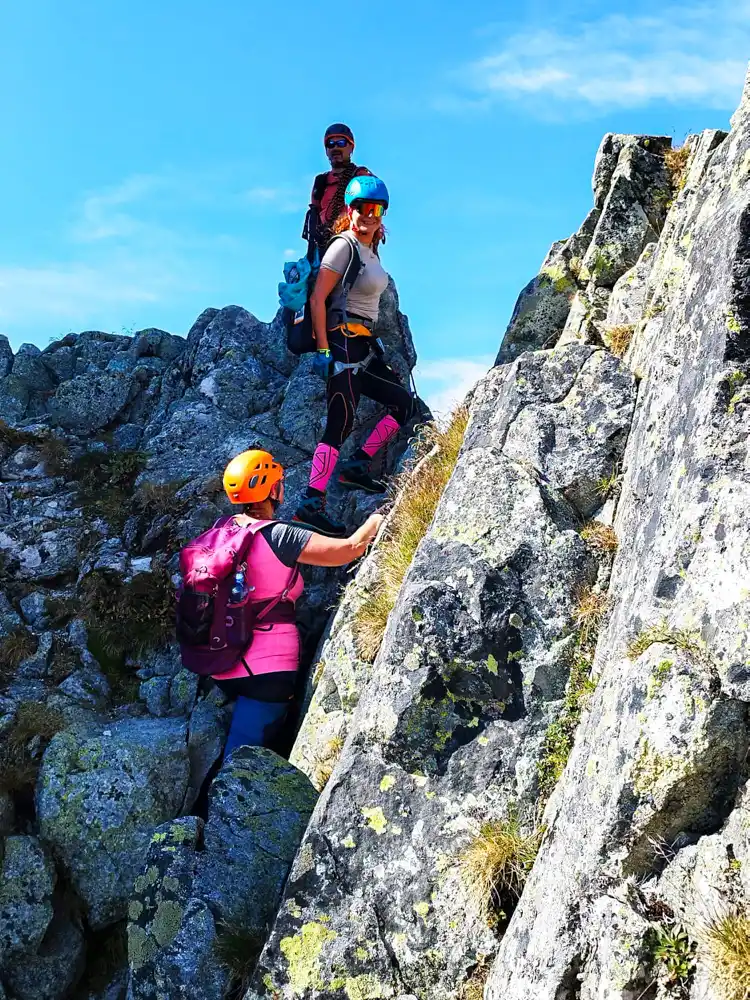 Afterwards, the terrain grew steeper. Sometimes we scrambled on all fours over sharp rocks until we reached the Saddle above the Kettle (2,440 m). The views over the High Tatras were breathtaking, but there was no time to linger – the harder part still lay ahead.