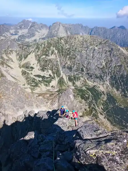 We continue further along the ridge, but we are still climbing. The ascent is more complicated, and the views are broader and more beautiful. Sometimes we have a short break while Tibor secures the rope in rugged terrain.
