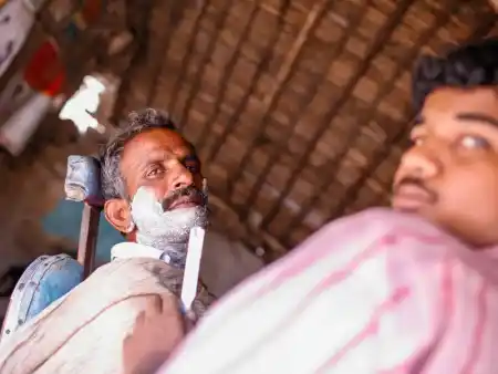 In a larger village, we pass bullock carts and weave through rickshaws, old bicycles, and screeching motorcycles barely holding together. We stop at a barbershop. Beneath a straw canopy, on the side of the road: a chair, a mirror hung on a tree, and a barber with a straight razor. His customer sits surrounded by dust and blaring trucks — and yet, the moment feels intimate and dignified.