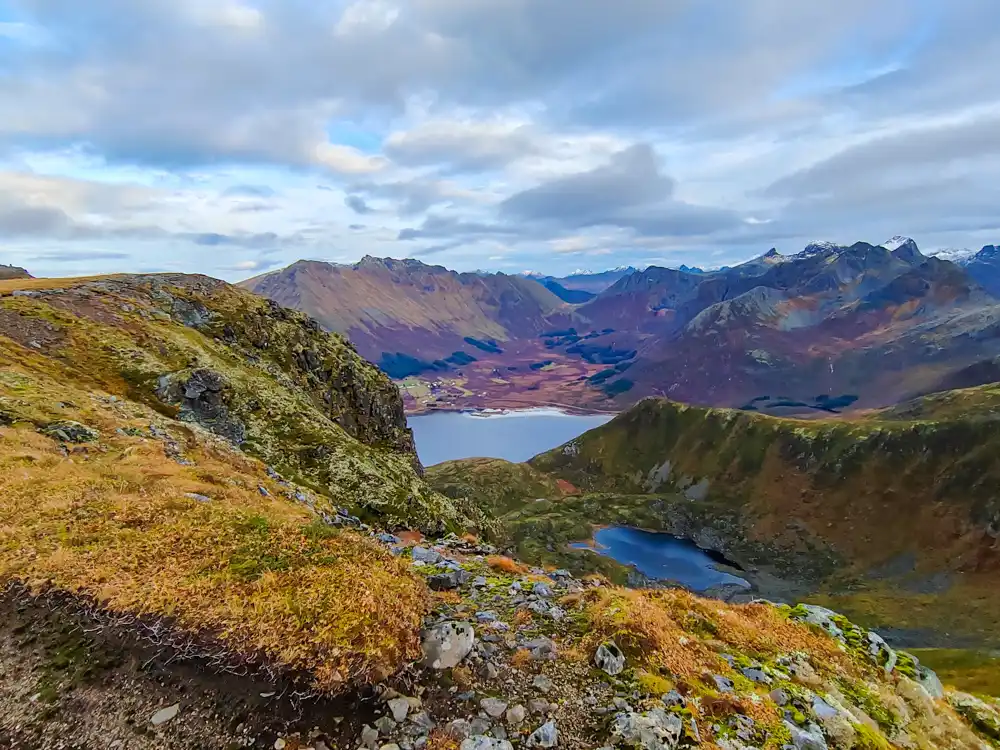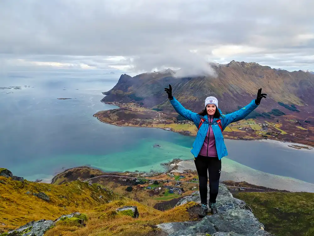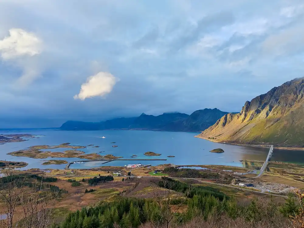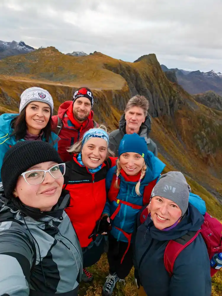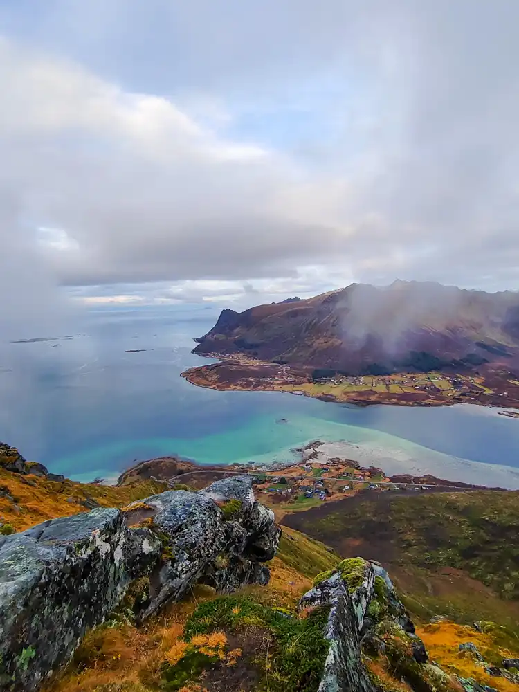 Then came the moment that stays with you forever: the mist suddenly lifted, revealing a breathtaking panorama of Lofoten. Jagged peaks soared over the deep blue fjords, small villages with red rorbuer glistened along the shore, and the scene looked utterly storybook. We all stopped, snapped photos, laughed, and simply drank in the beauty.