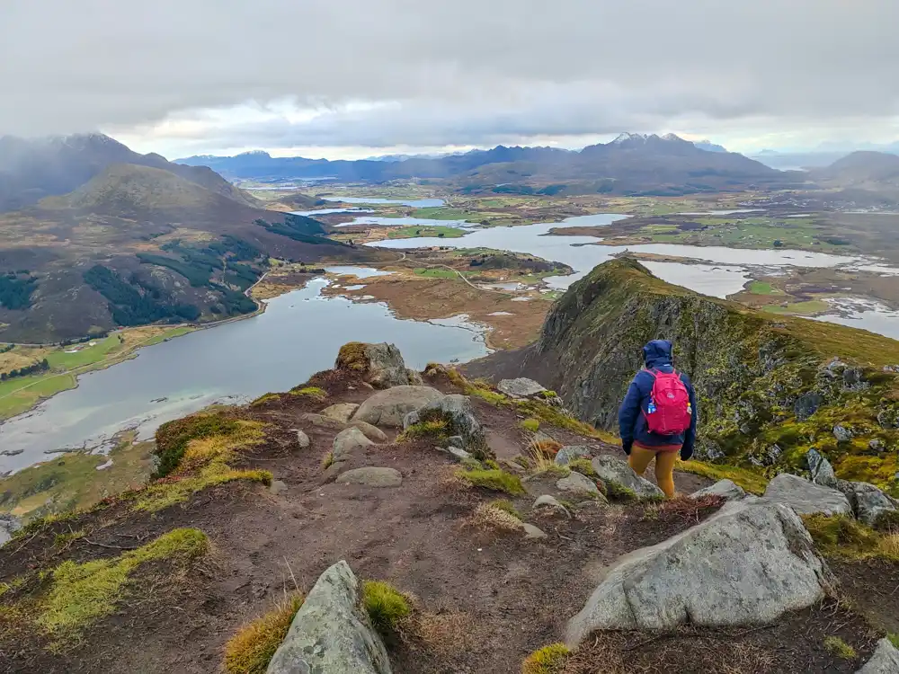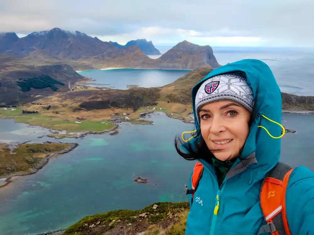 We knew we were in for a day to remember. Offersøykammen might be less famous than some other peaks, but every step was worth it. The trail led us over green meadows, rocky patches, and steep paths – each step a small reward. The higher we climbed, the more dramatic the scenery became: jagged peaks, winding fjords, and below us, the dazzling white Kvalvika Beach, as if plucked from a postcard.