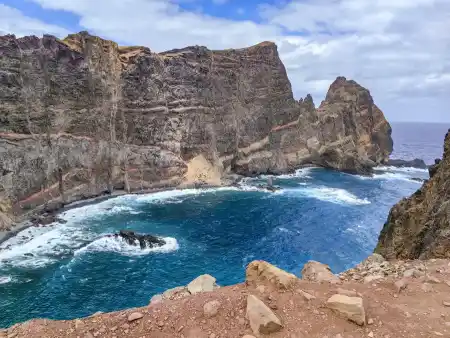 On the eastern side of the trail, you’ll marvel at towering cliffs and the vast Atlantic Ocean. To the west, the view opens to Madeira’s lush valleys and jagged mountain peaks. The hiking trail (vereda) takes you to the island’s northernmost point, where a lighthouse awaits—but reaching it on foot is impossible without a boat.